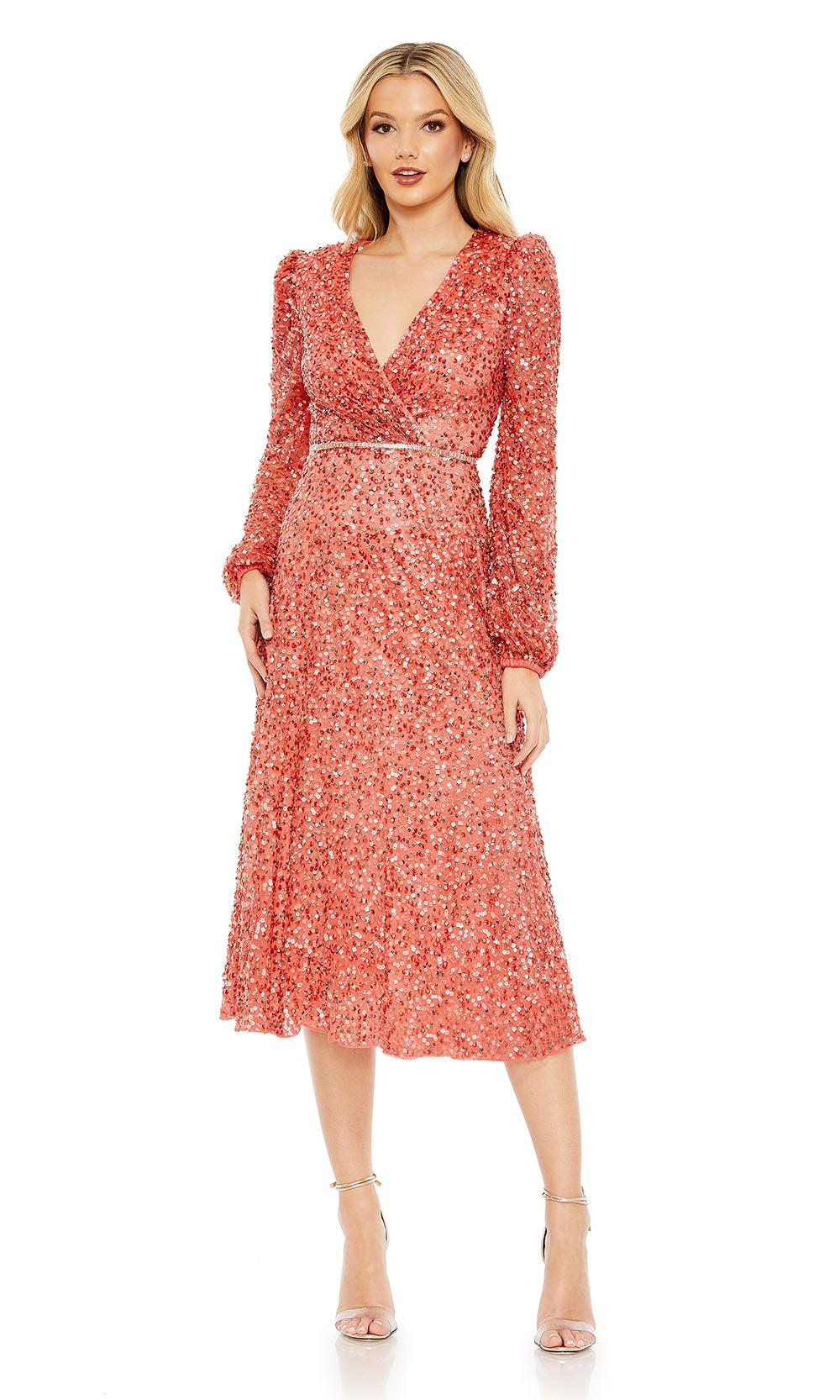 Mac Duggal - 10801 Short Sleeve Sequin Tea Length Dress In GreenMac Duggal - 10801 Short Sleeve Sequin Tea Length Dress In Pink