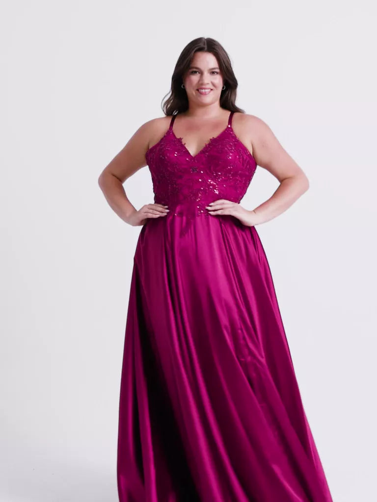 Woman wearing a green evening gown with a slit on a white background, branded 'Faviana'.Woman wearing a green evening gown with lace-up back, branded 'Faviana'.