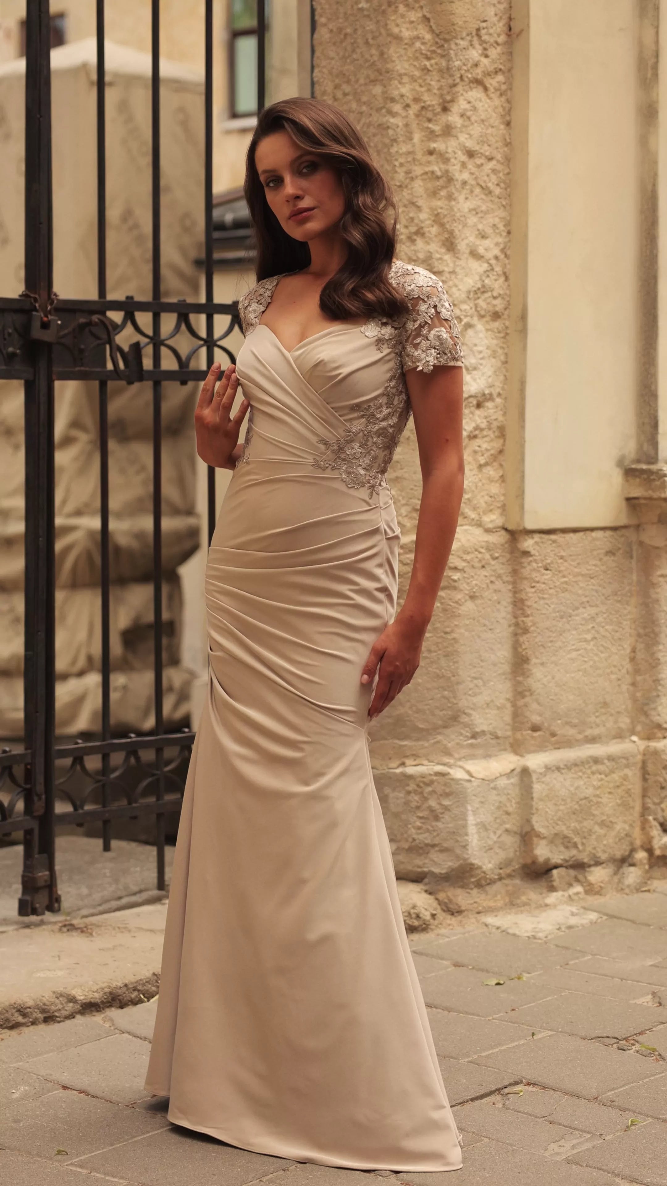 Woman wearing a silver evening gown with lace sleeves on a white backgroundLong silver evening gown with lace top on a white background