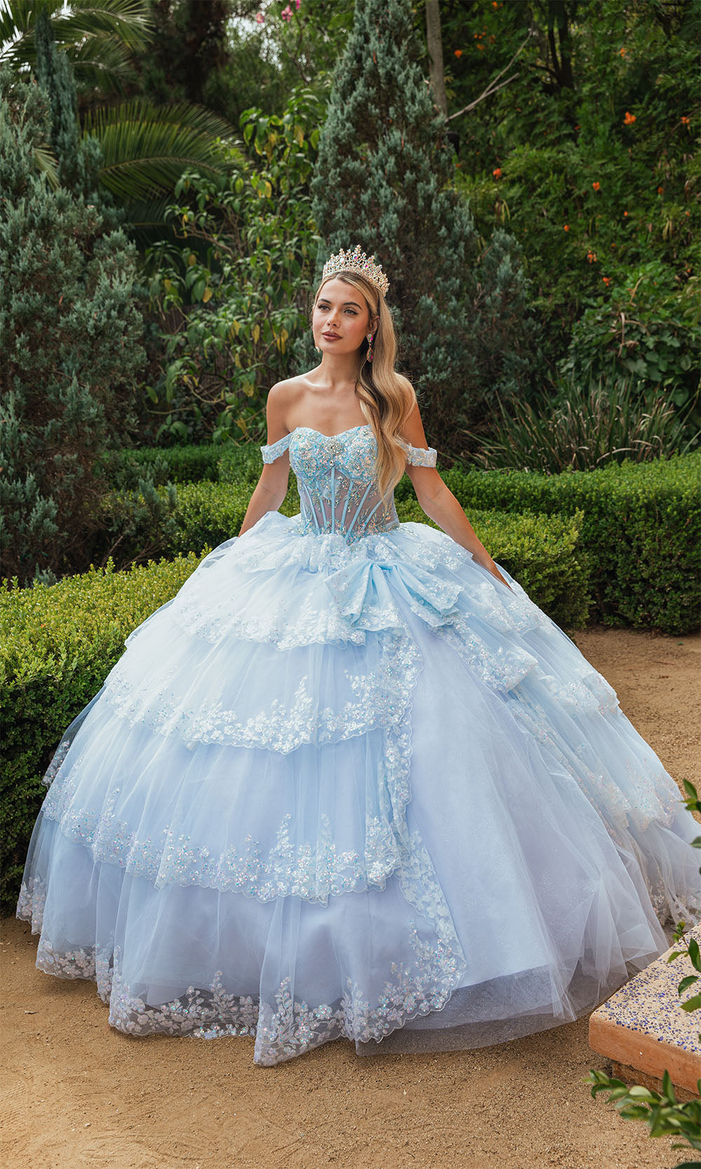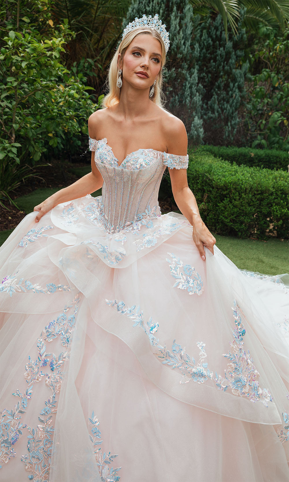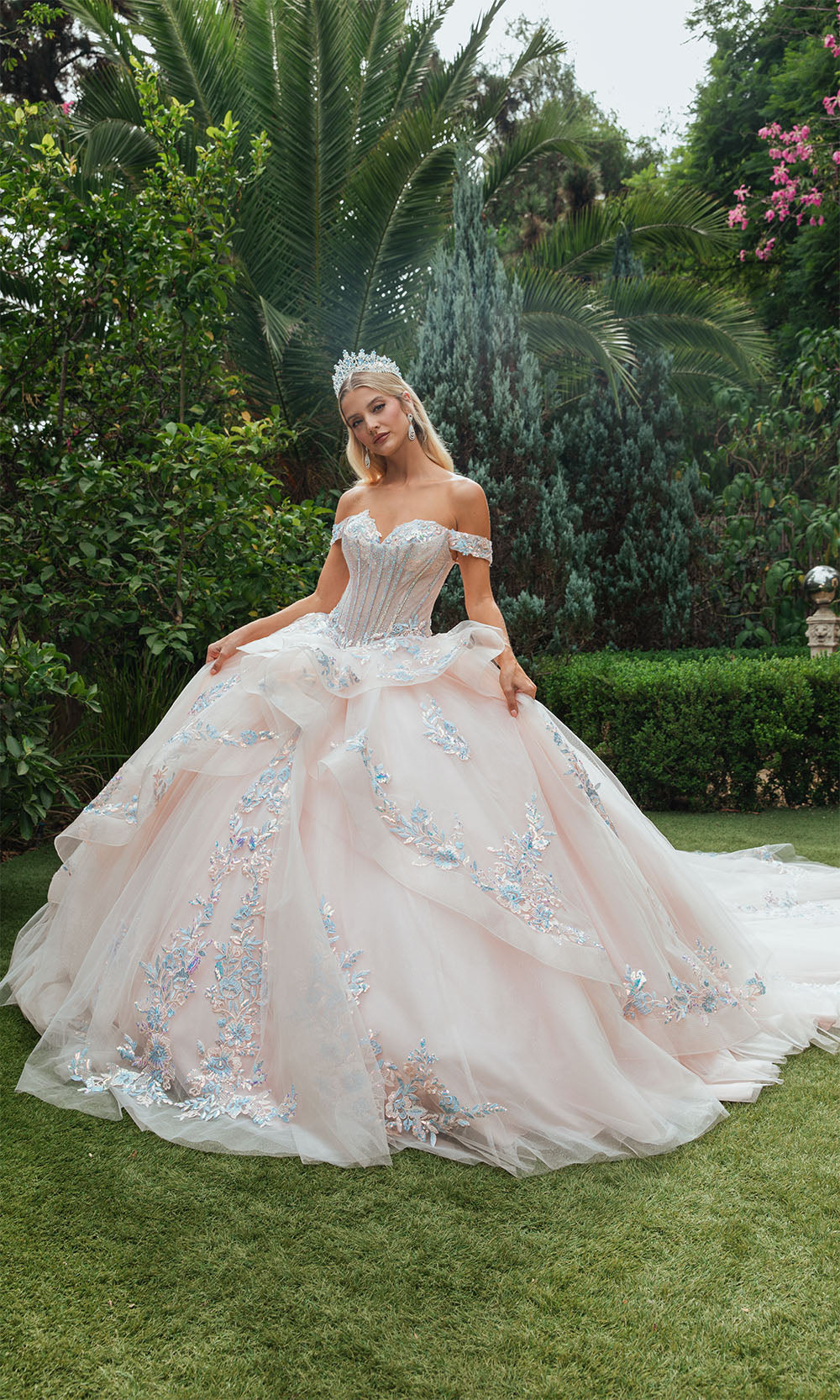 The most popular style of 2025 is a two piece Sweet 16 dress, or an off shoulder Sweet 16 ball gown. The ballgowns are available in blush pink, aqua blue, royal blue, champagne, ivory, lilac, fuchsia, coral, magenta, purple, red, and even white. We have all colors available no matter what your motif theme is.
