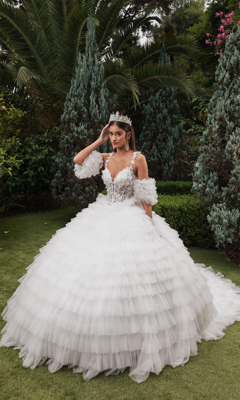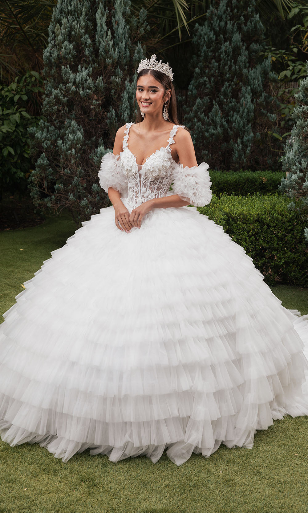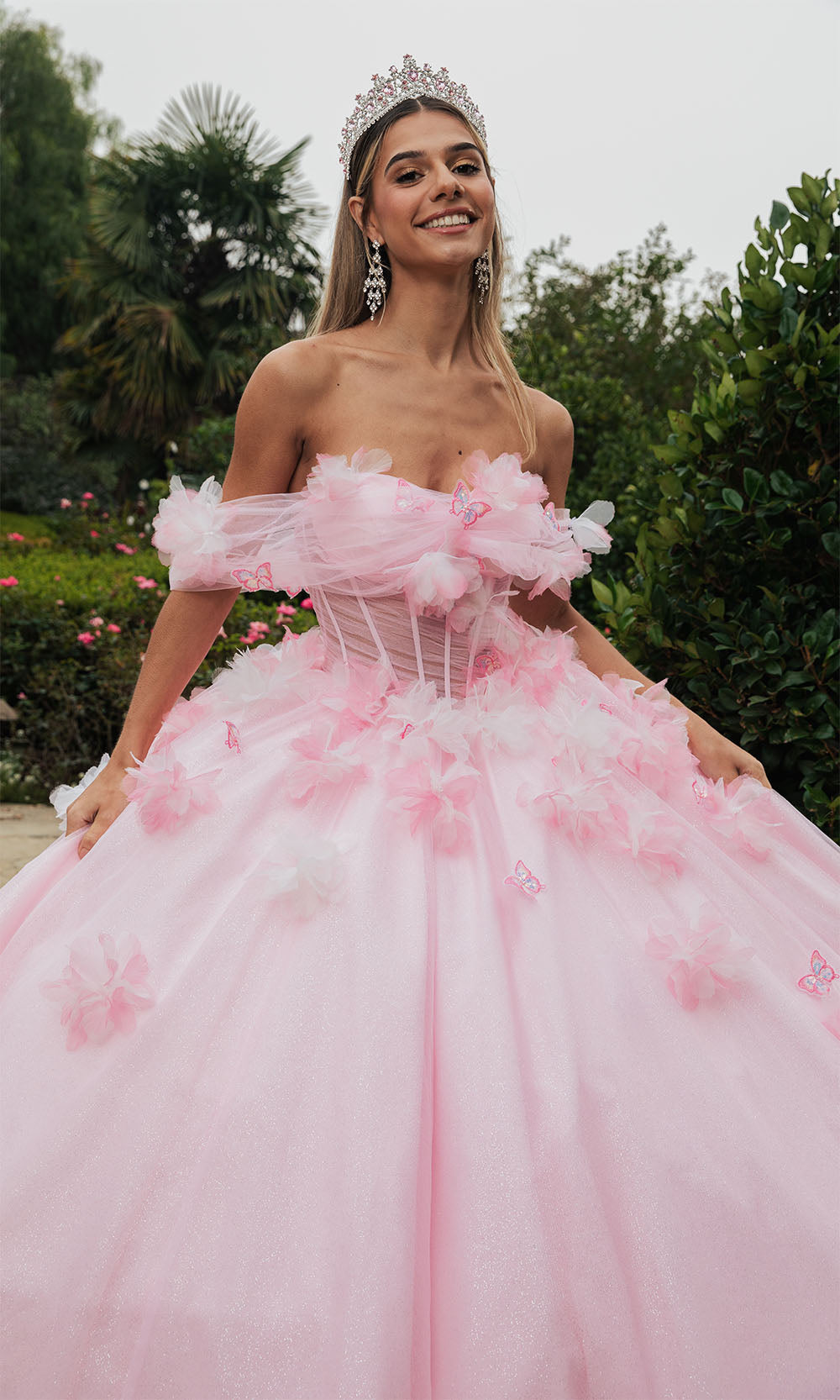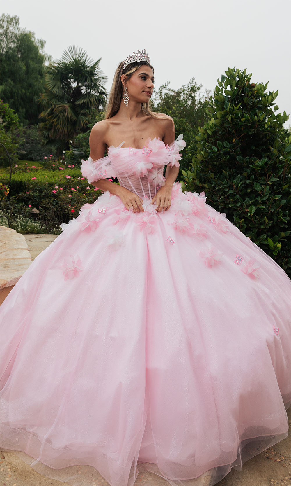 The most popular style of 2025 is a two piece Sweet 16 dress, or an off shoulder Sweet 16 ball gown. The ballgowns are available in blush pink, aqua blue, royal blue, champagne, ivory, lilac, fuchsia, coral, magenta, purple, red, and even white. We have all colors available no matter what your motif theme is.