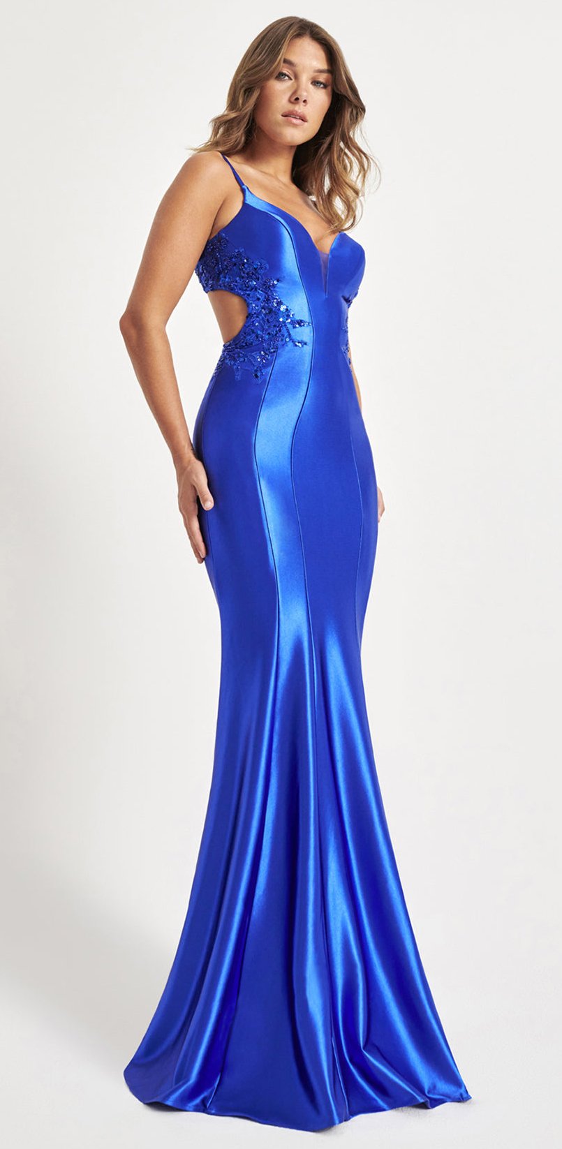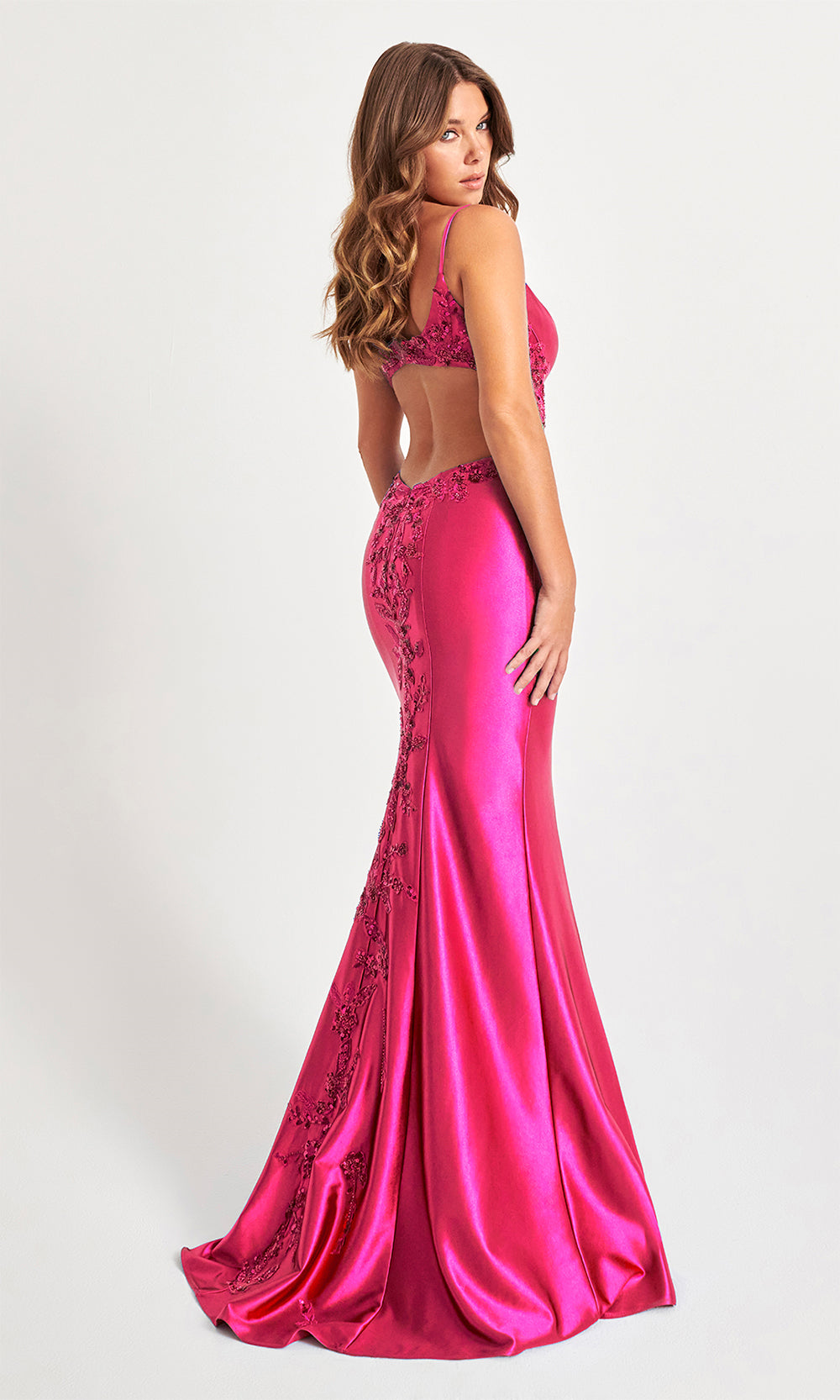Step into the spotlight with Faviana 11007, an enchanting gown crafted from luxurious stretch satin. This dress exudes modern elegance with its V-neckline, delicate spaghetti straps, and a dramatic sweep train that adds a touch of drama to your entrance. The fitted bodice features an alluring illusion inset, while the open back and stylish cutout design create a mesmerizing look. A back zipper ensures a secure fit, and the dress drapes beautifully to the floor, making it perfect for formal events, galas, or any special occasion where you want to make a lasting impression. Make a statement and captivate the crowd in this stunning ensemble.