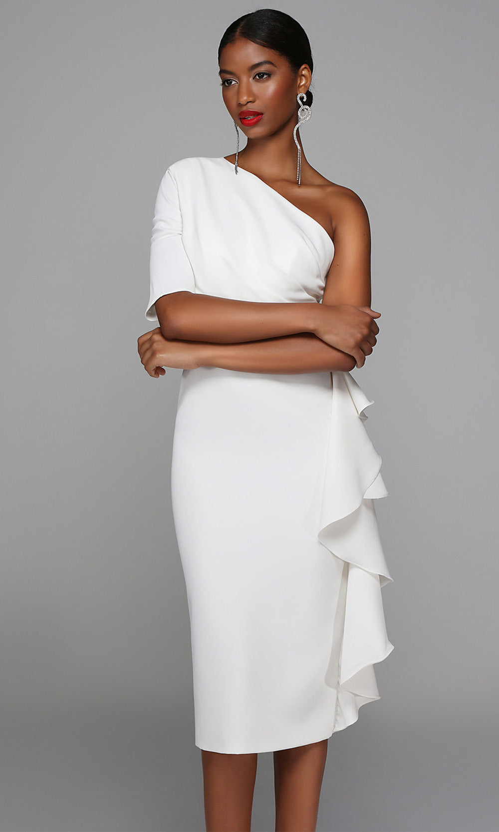 Details: One Shoulder, Quarter Sleeve, Pleated Bodice, Side Ruffle, Back Slit, Back Zipper Closure