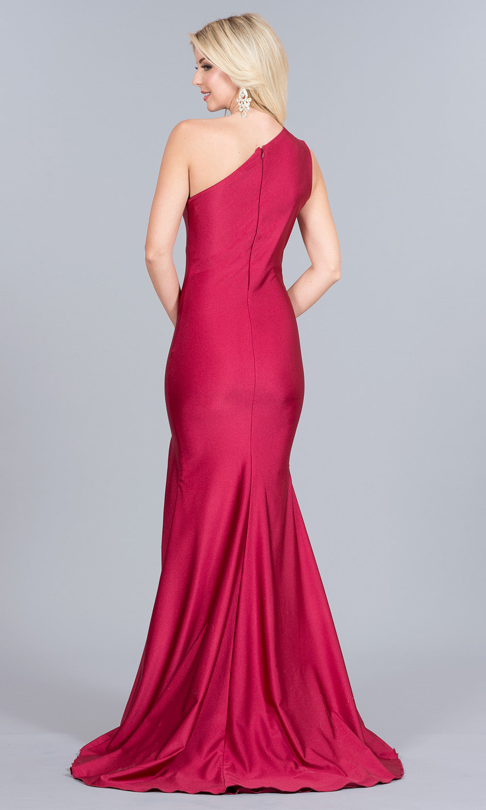 Ensconce yourself in a stellar style in this Atria 6008H creation. Embellished with ruching that adds dimension to its silhouette, this gown flaunts a one shoulder neckline with a diagonal cutout. Styled with a high slit, the mermaid skirt streams and flares into a pool of train. Dance the night away in this Atria masterpiece.