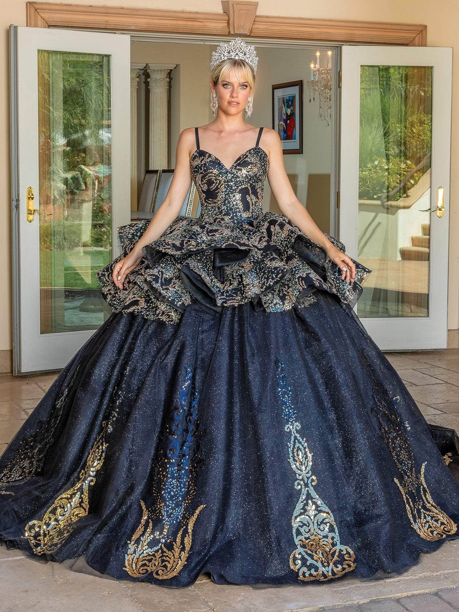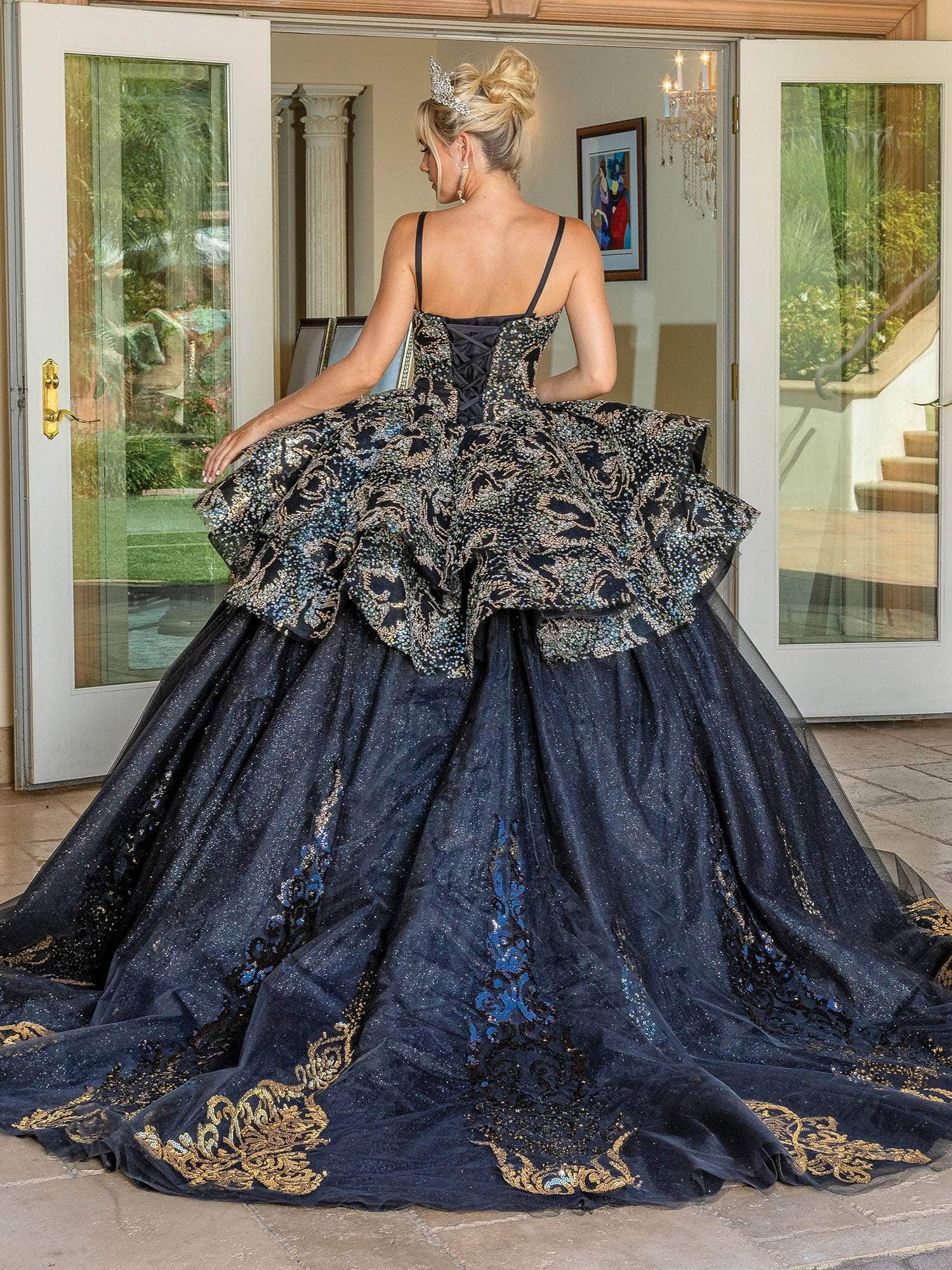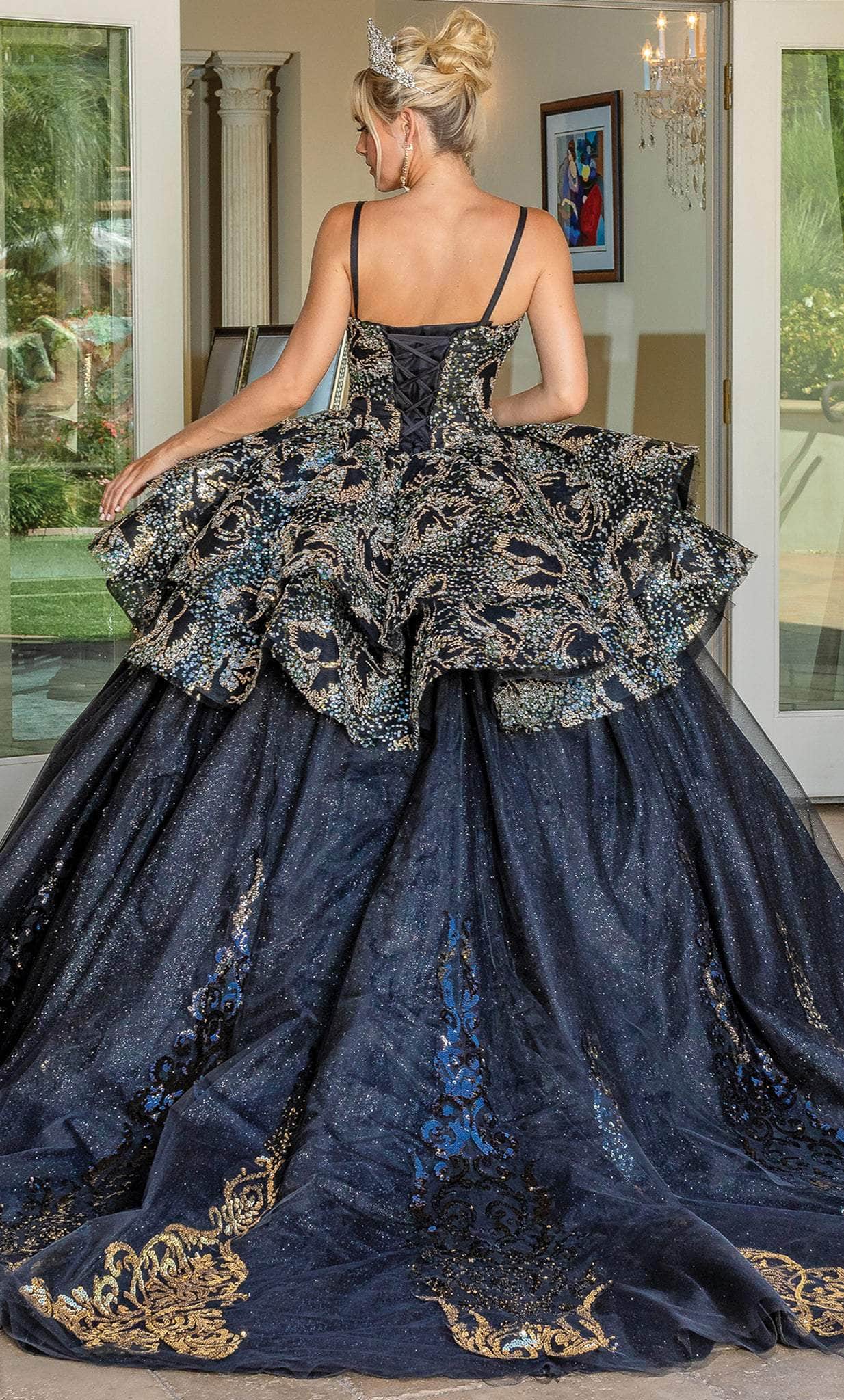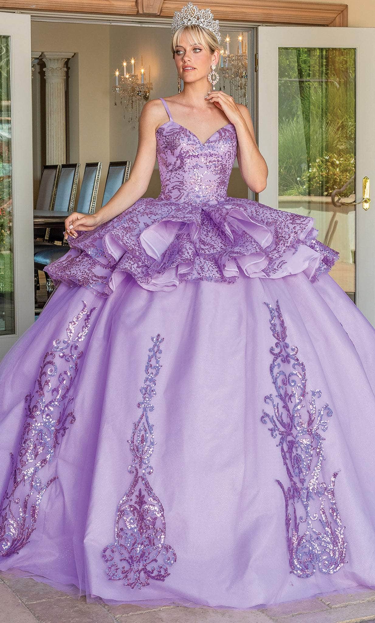Embrace this amazing Dancing Queen 1656 creation's magnificent flair to glam up. This dress flaunts a sweetheart neckline and spaghetti straps while being carved with tracing lines and embellished with sequin accents on the bodice. The ballgown skirt glides flawlessly down to a sweep of train and is designed with a corset-styled back and an embroidered, voluminous peplum. Unveil this glitzy Dancing Queen masterpiece and shine with the grace of a queen.