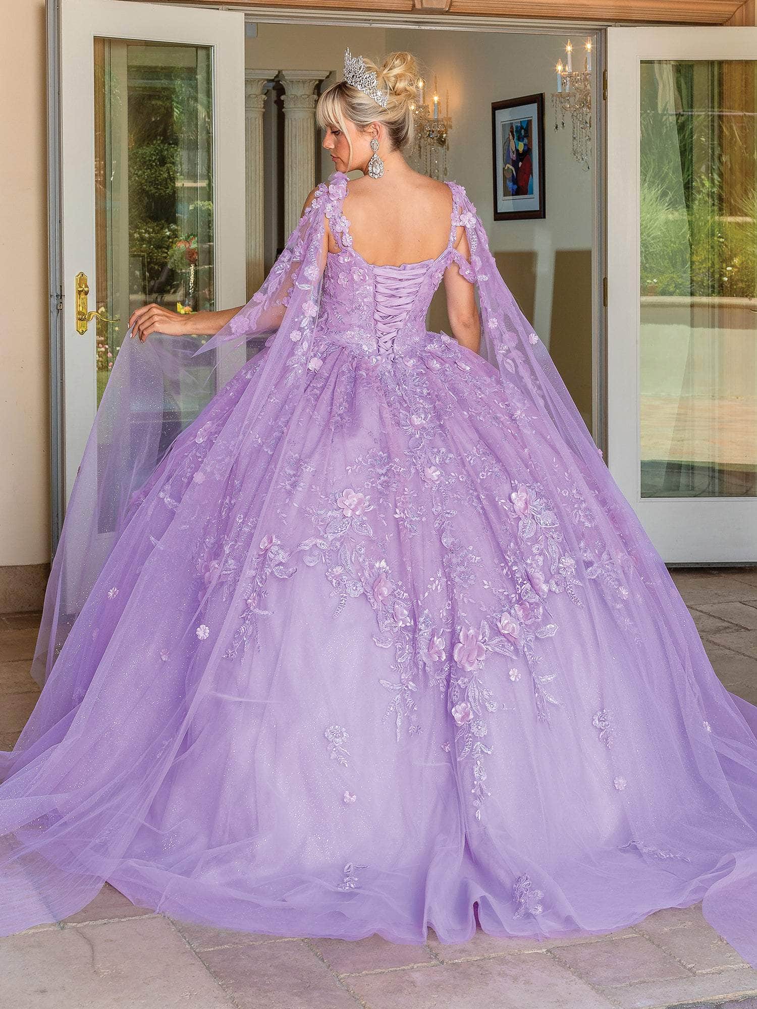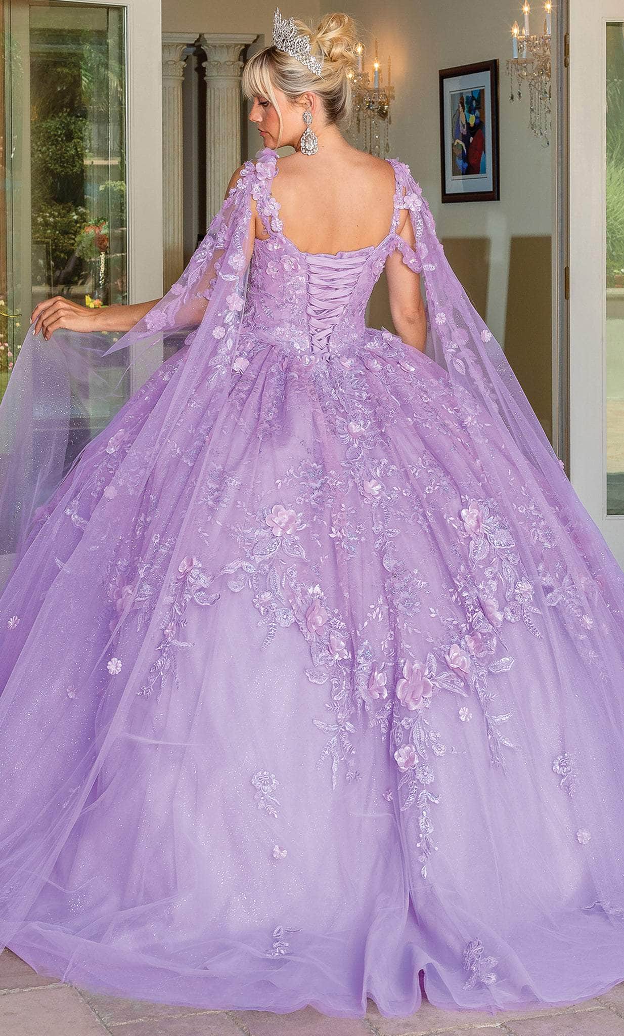 In this Dancing Queen 1664 masterpiece, steal the show and sparkle at your Quinceanera celebration. This beauty begins with a v-neckline and floral-adorned shoulder straps before being enchantingly embellished with 3D blossoms and glittering accents. Sheer cascading sashes pour down to the floor and are detailed with a corset back. The train sweeps beautifully down from the flawless ballgown skirt. Flatten your best features as you take center stage in this Dancing Queen masterpiece.