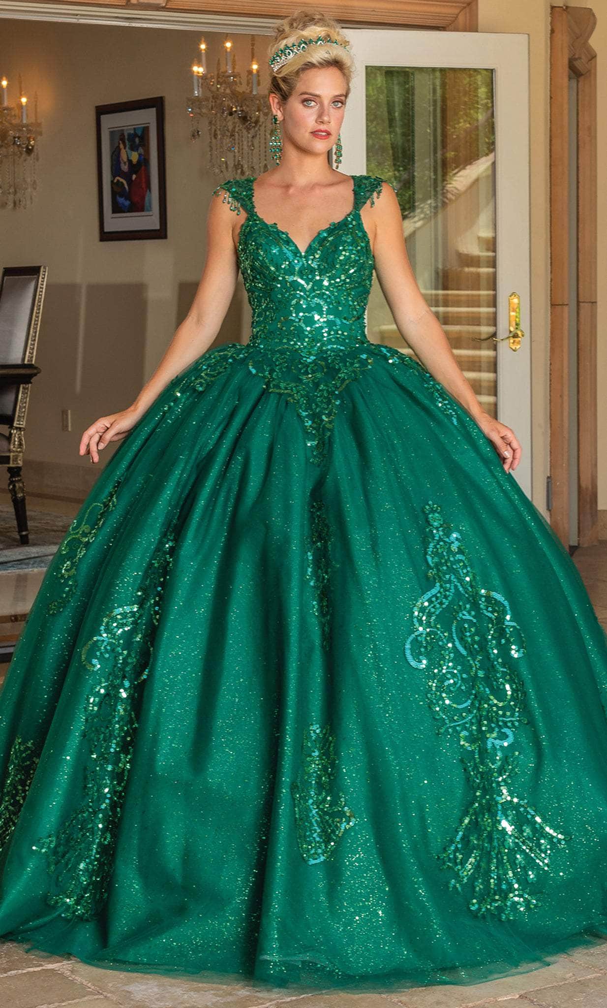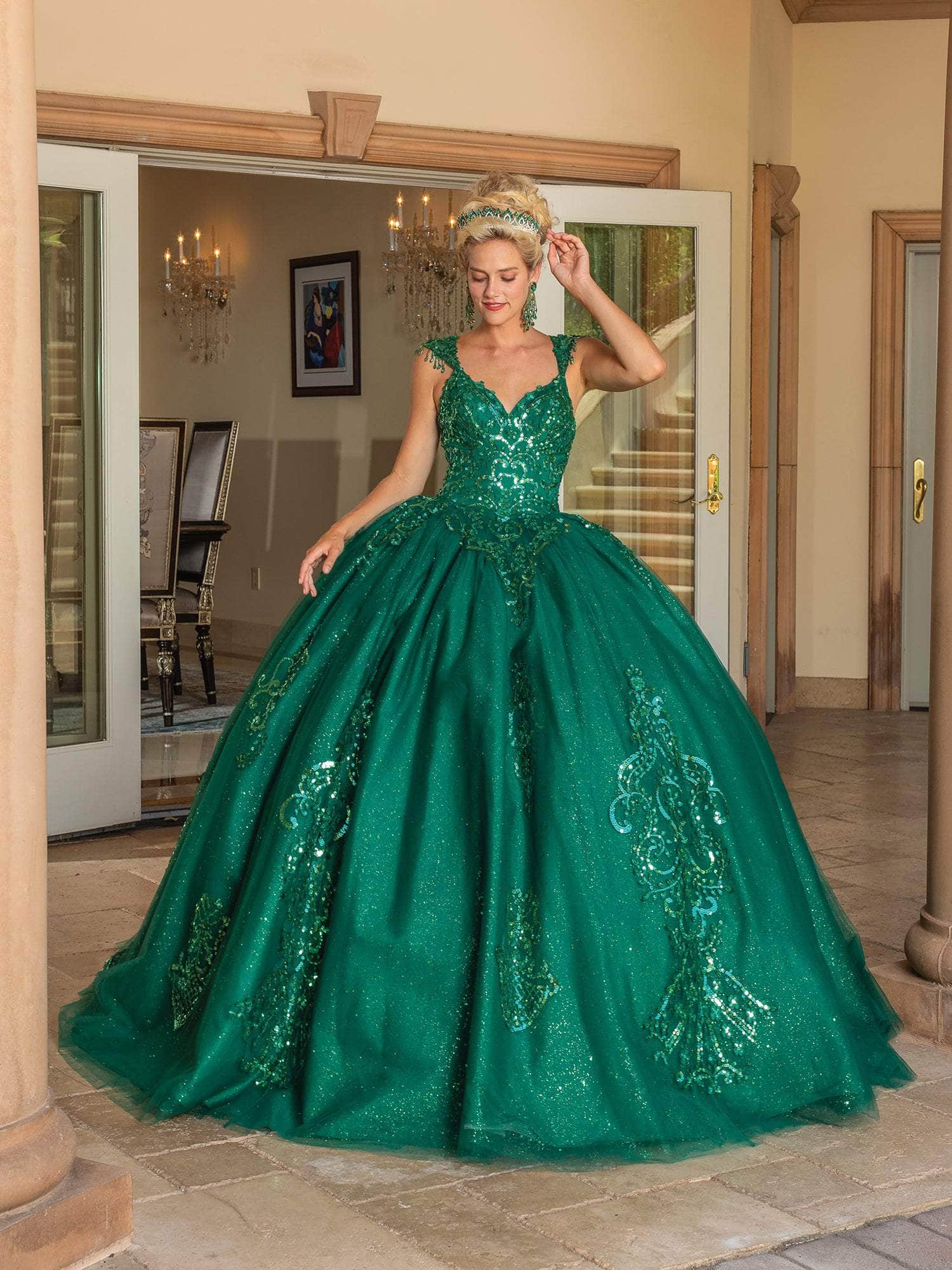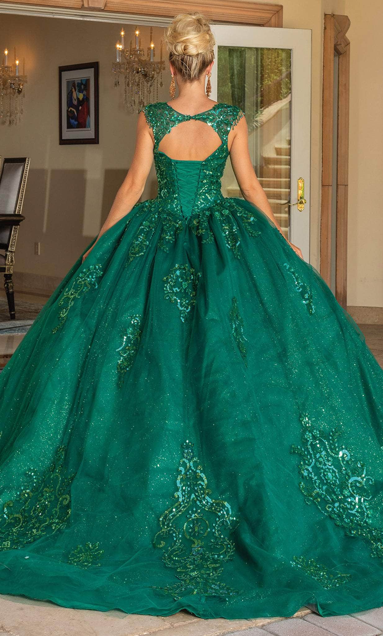 In this stunning Dancing Queen 1758 design, exude a charm that is intended to enchant the affluent crowd. Amazingly covered in glistening sequins, this dress has cap sleeves with amusing beaded fringes and a sweetheart neckline. The back is cut off, showing a bit of skin, and is fastened with a corset lace-up tie clasp. It has a dramatic sweep train, full-length hem, and voluminous ballgown skirt. This Dancing Queen 1758 dress is an exceptionally stunning appearance.