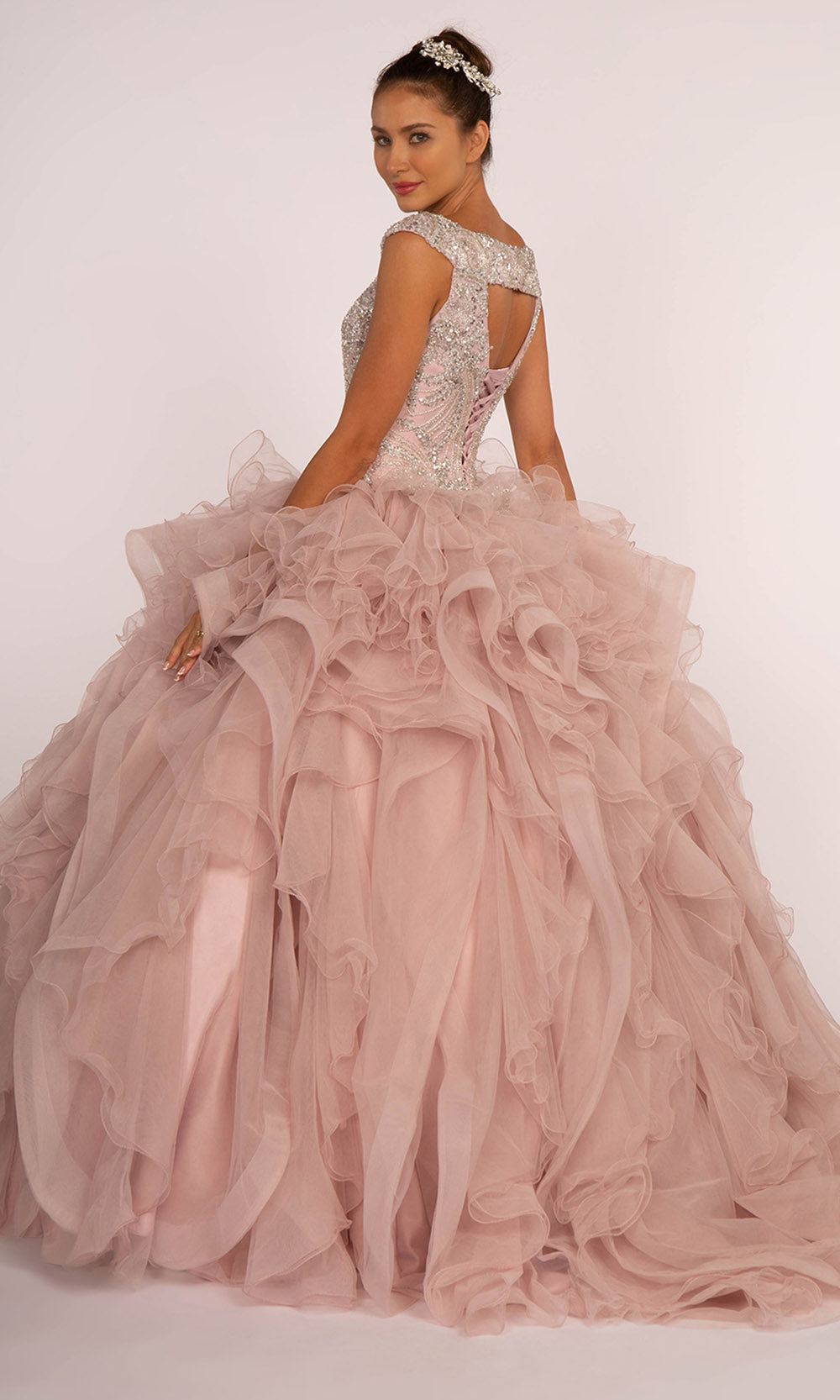Details: Metallic Beaded, Layered Ruffles, Horsehair Trims, Cap Sleeves, Cutout Corset Back, Lace Up Details, Sweep Train