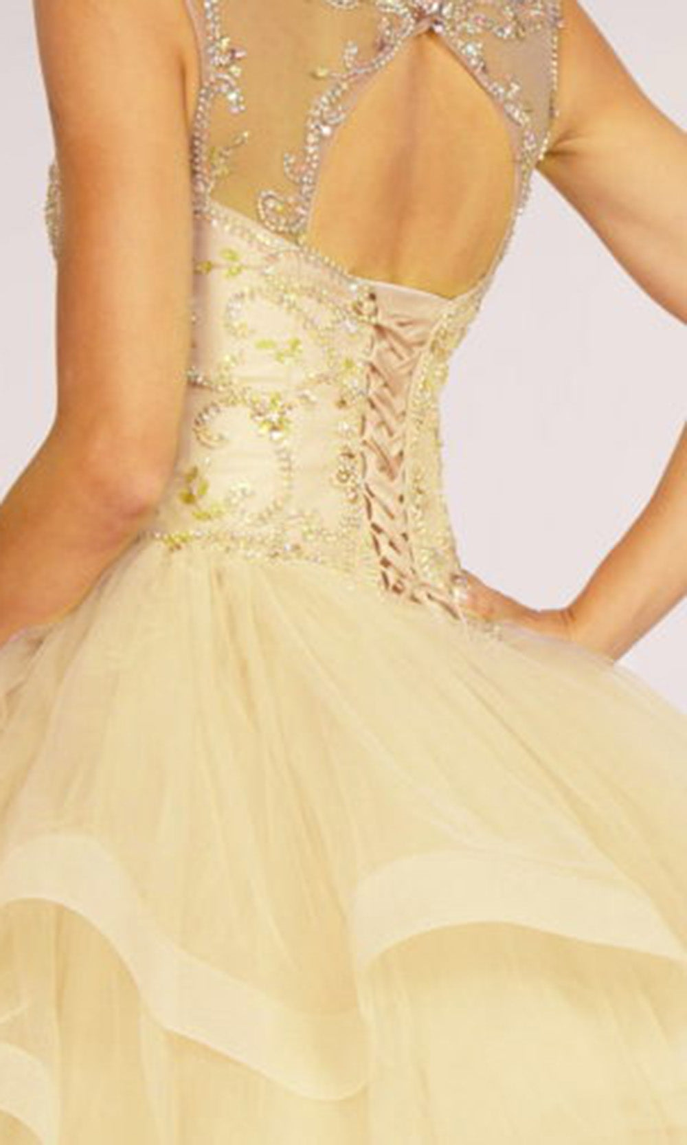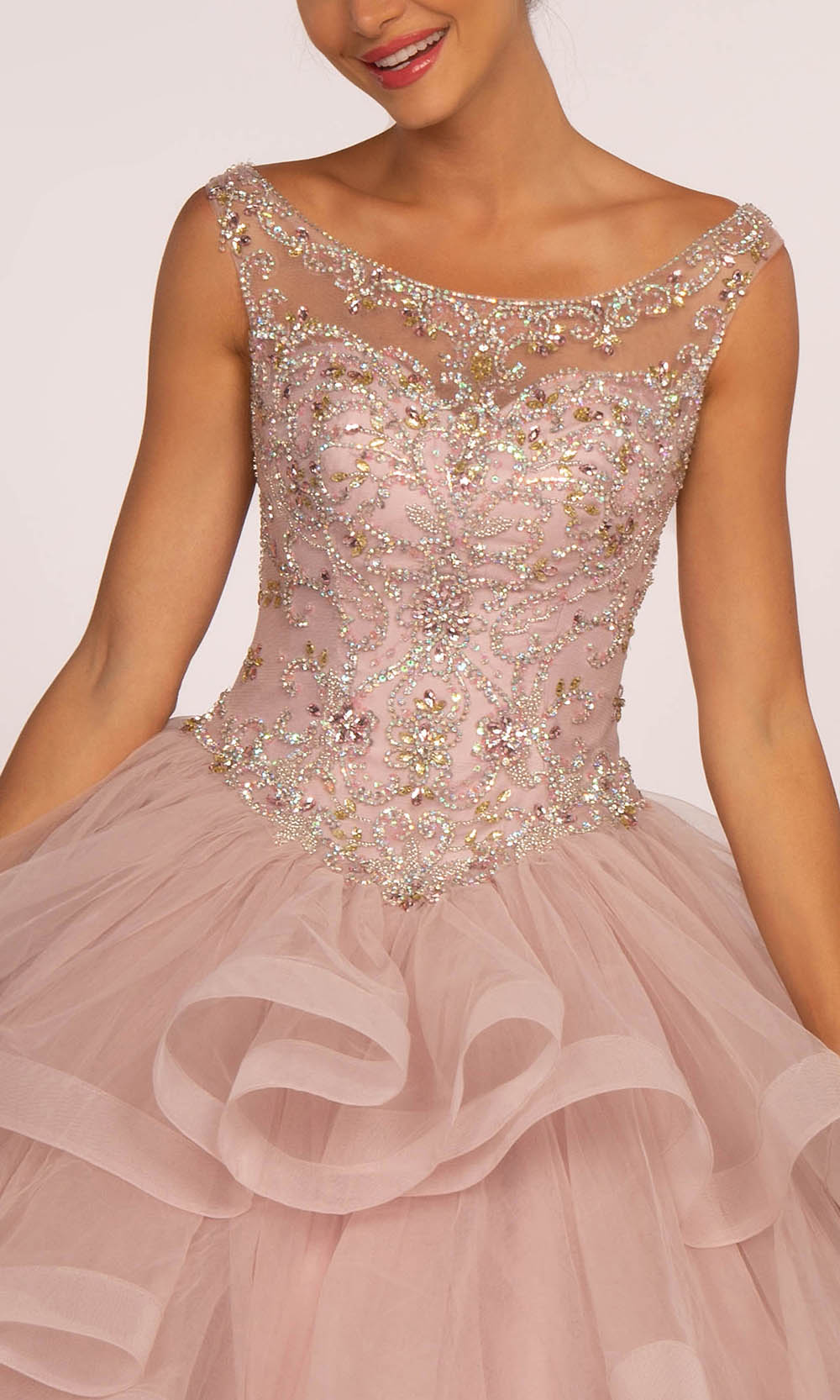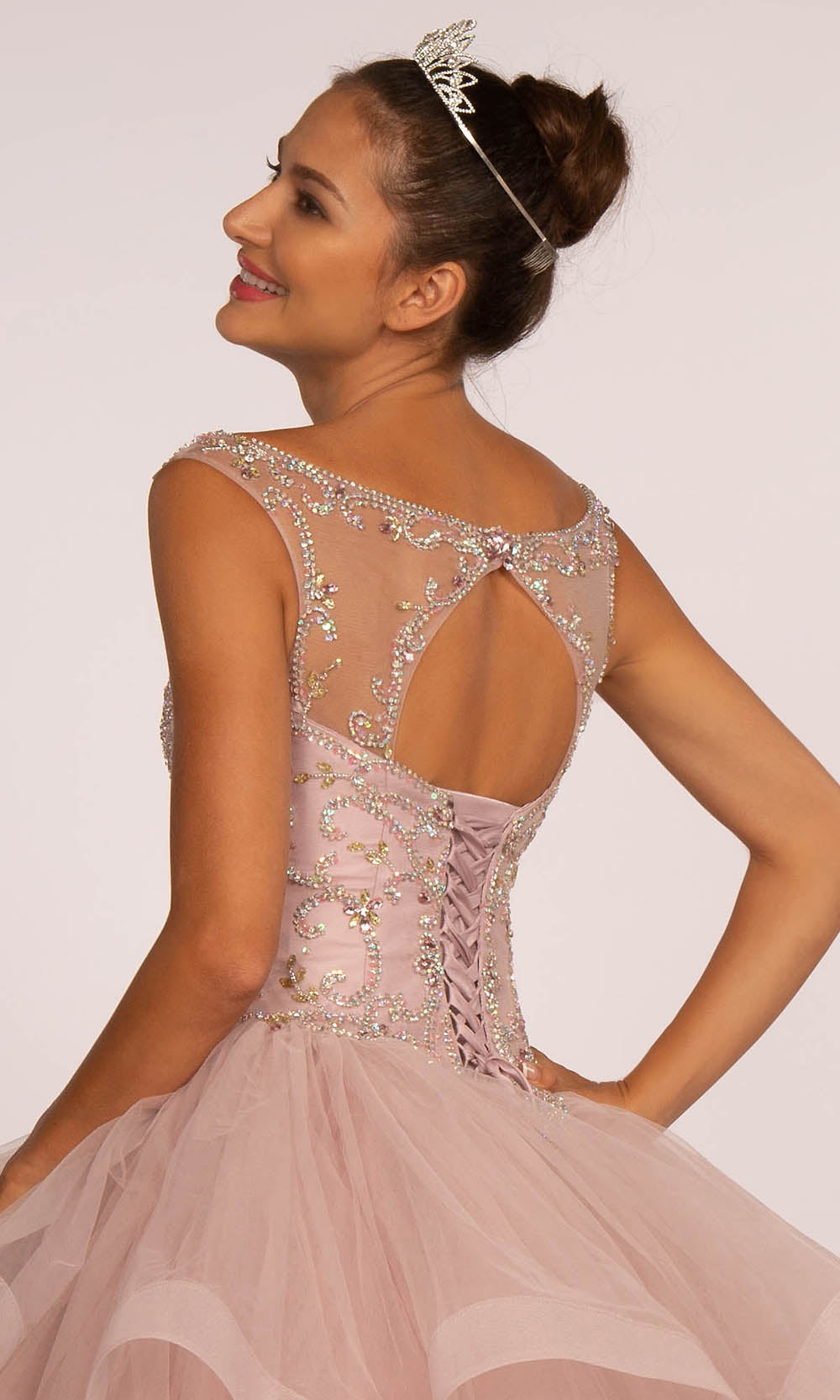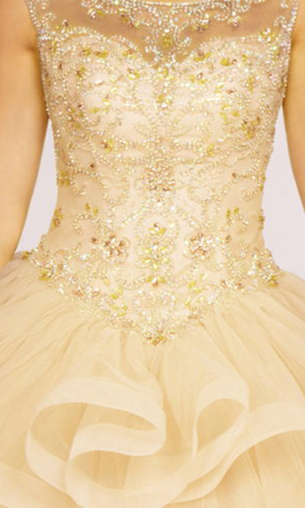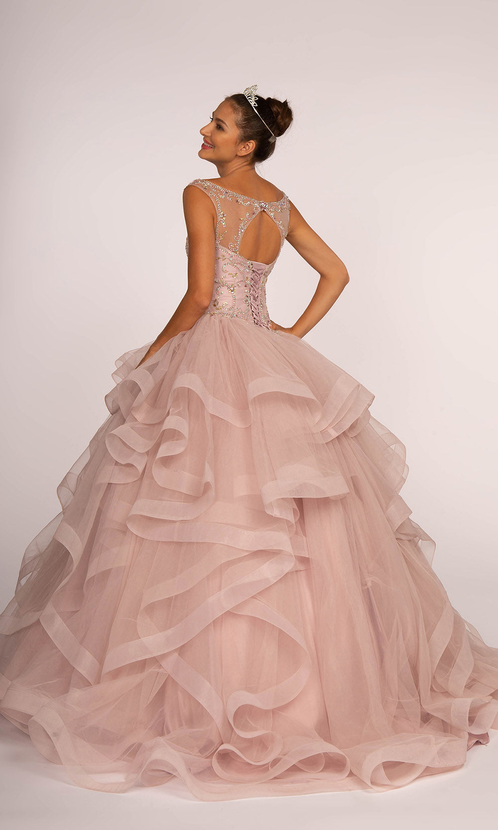 Indulge in the royal treatment with the Elizabeth K GL2600, a majestic masterpiece that will make you feel like a princess. This Quinceanera gown boasts a fitted bodice adorned with sparkling bead embellishments, complemented by an illusion halter neckline and mid-open back. The ballgown skirt is adorned with glitter patterns and embroidered lace appliques, making a bold statement, while the gorgeous sweep train adds a dramatic finish. Make unforgettable memories wearing this marvelous Elizabeth K ensemble that's fit for a royal occasion.