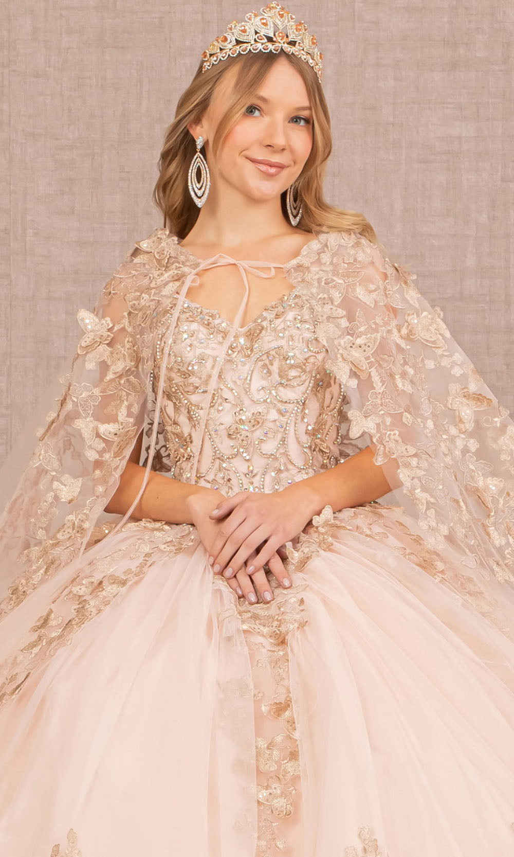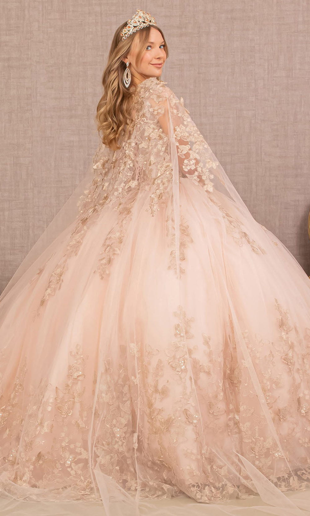 Show off your exquisite taste at your Quinceanera in this stunning gown by Elizabeth K GL3104. This dress has a v-neck and is cinched at the waist with a lace-up back, and it is exquisitely decorated with tonal beadwork and butterfly appliques on a corset-structured bodice. This dress has a ballgown shape and a train, and it is accentuated with layers of frothy materials and a cape covered in appliques. Make magic in this fantastic Elizabeth K GL3104 creation!
