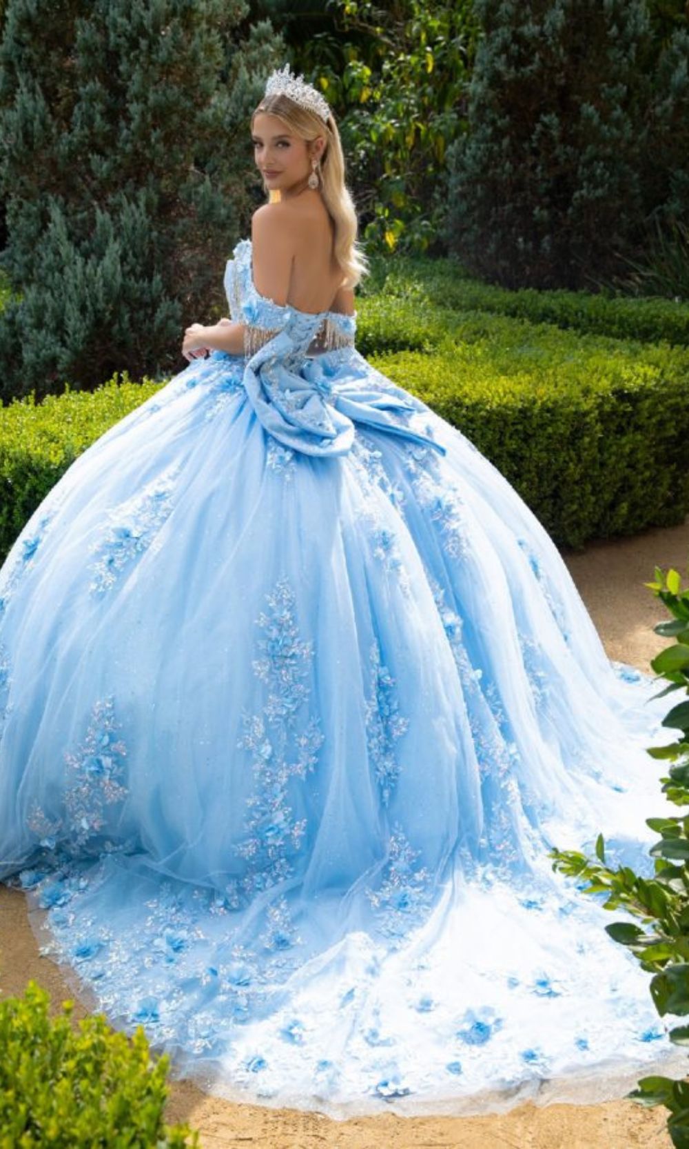 Elizabeth K GL3525 is an enchanting ball gown crafted from luxurious mesh and tulle fabric. Featuring a strapless sweetheart neckline with elegant cut-away shoulder sleeves, the corset bodice is adorned with intricate 3D floral appliqué, beads, fringe, embroidery, glitter, jewel, and sequin embellishments for a dazzling finish. Delicate bow accents add a charming touch, while the open lace-up back ensures a secure and flattering fit. Flowing to a graceful floor-length hem, this gown is perfect for creating a regal and unforgettable presence at any grand event.