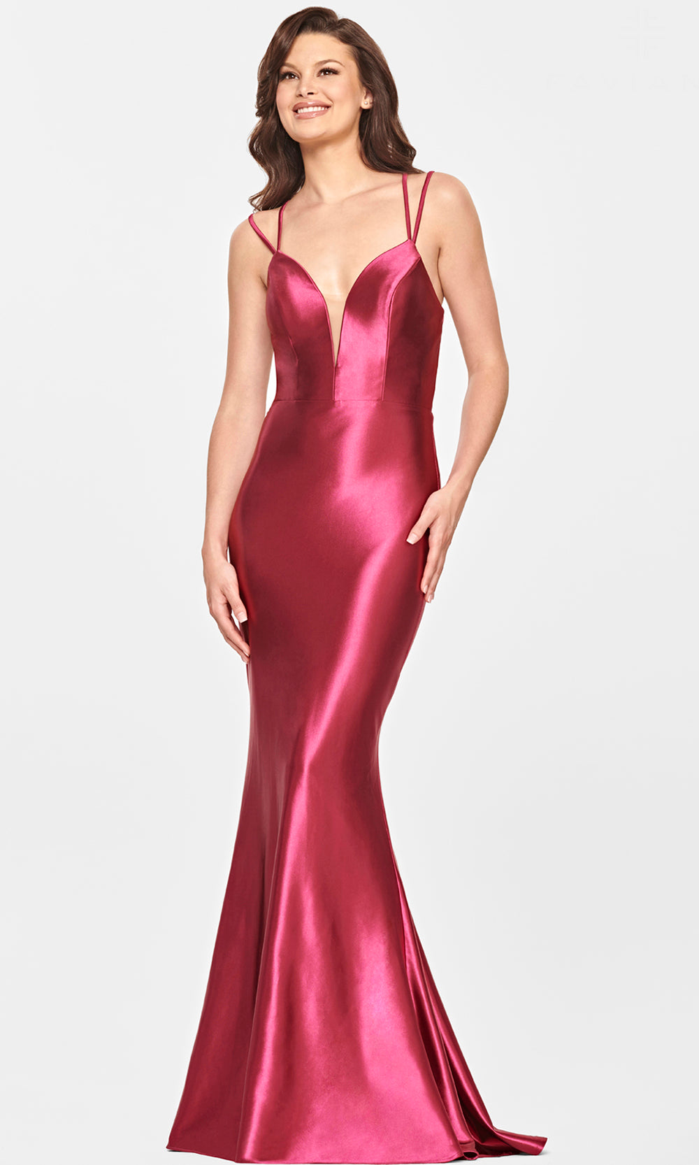 Embrace a wonderful evening in this wondrous Faviana S10810 masterpiece. Flaunt a fabulous figure in this satin gown contoured with seams and features a plunging v-neckline with sheer inset at the bust. Supported by delicate dual spaghetti straps, the open back is eye-catching with its strappy details and a ruching zipped-up closure at the bottom. The full-length skirt sculpts a mermaid silhouette with a regal sweeping train. You are statuesque in a posed gown from Faviana S10810.