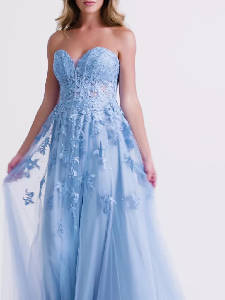 Details: Strapless, Tulle, Applique, Sweetheart neck, Corset bodice, A-line, Slit, Invisible back zipper, Hook, Eye closure