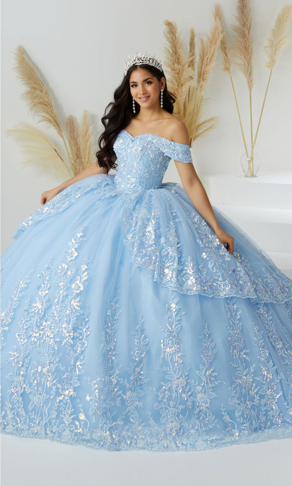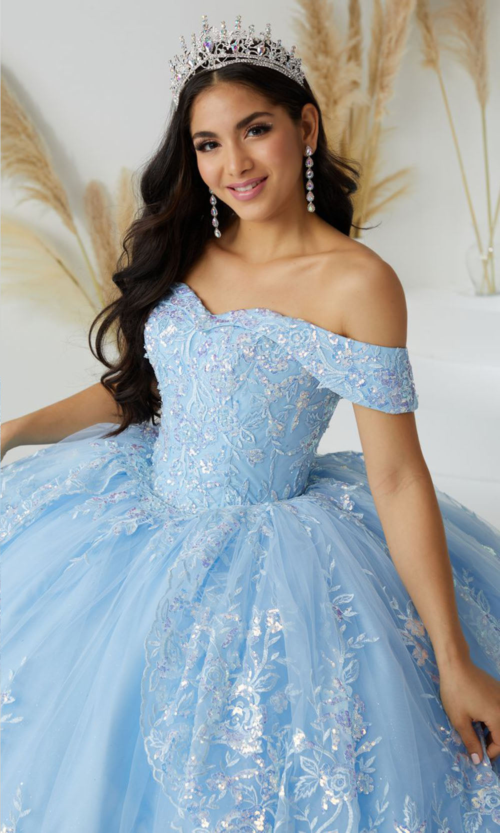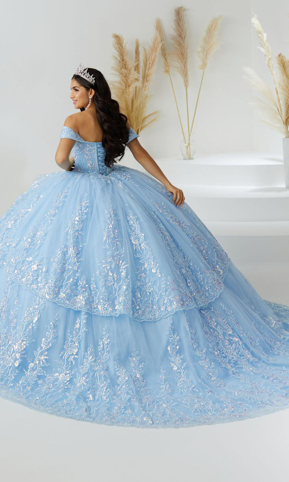 The House of Wu 26037 gown is a mesmerizing blend of elegance and glamour. Crafted from liquid lace, 3D sequin lace, and sparkle tulle, it exudes luxury and sophistication. The strapless design and off-shoulder neckline showcase your shoulders and collarbone, creating a captivating frame. Adorned with intricate 3D sequins, lace, and floral details, the corset bodice adds a touch of opulence. The open back with a crisscross design offers a contemporary twist to the classic silhouette. Completing the look is a court train that ensures you make a stunning entrance and exit at any formal event.