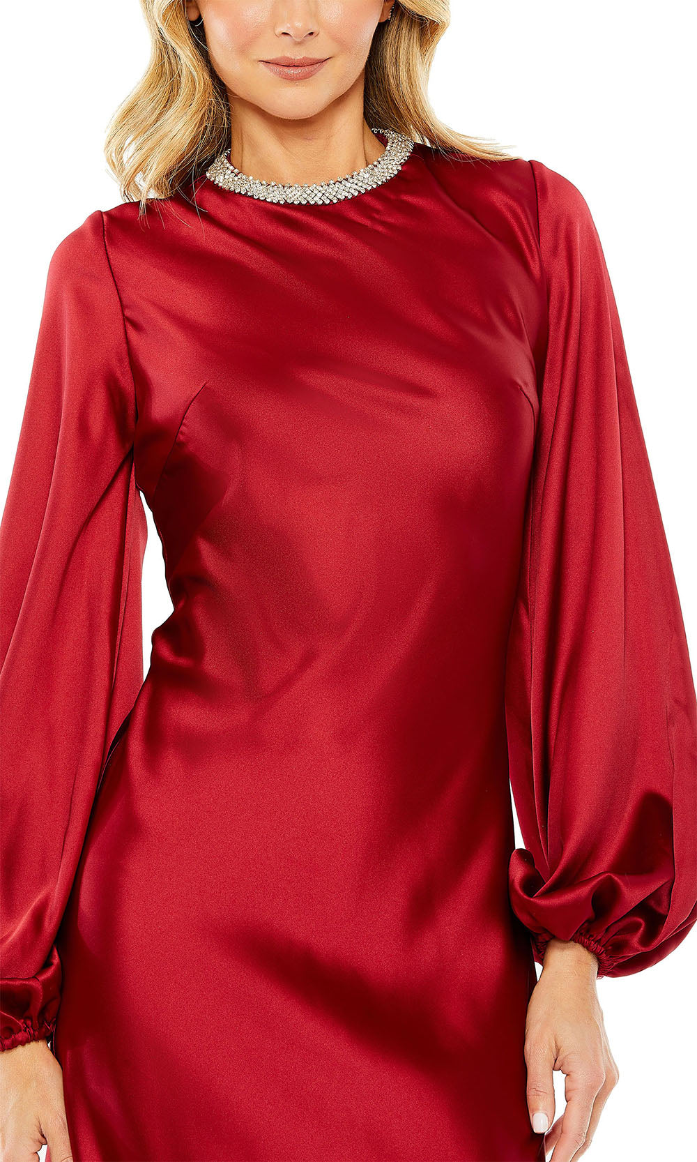 Radiate sophistication in Ieena Duggal 27350, a gorgeous gown crafted from luxurious satin fabric. The puff long sleeves exude elegance and are adorned with intricate beadwork, along with a crystal neck for a touch of glamour. The fitted bodice provides a flattering silhouette, while the high neckline adds a hint of regal charm. The high back, along with a concealed back zipper, ensures a polished look. This tea-length dress is perfect for semi-formal occasions where you want to make a chic and memorable entrance.