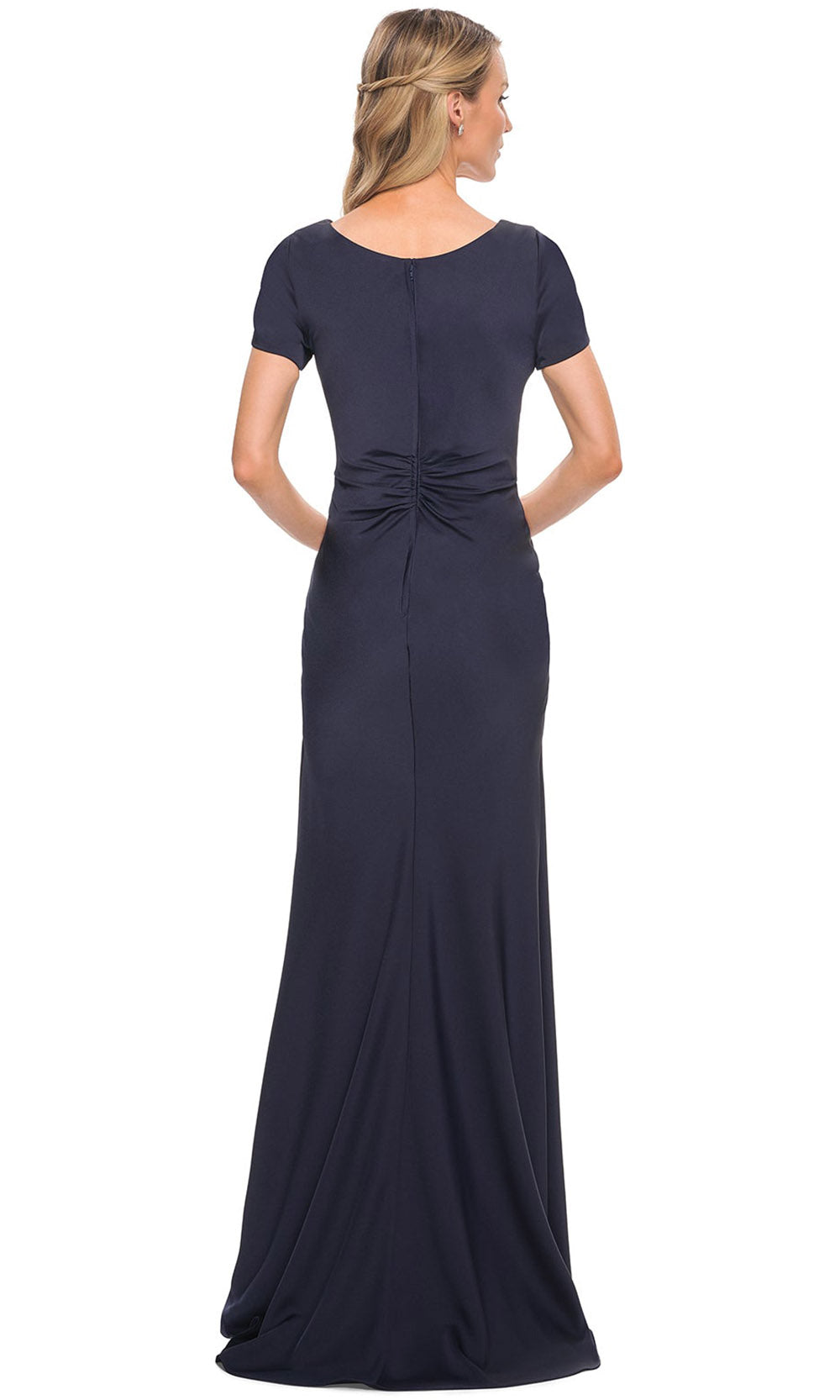 La Femme - 29926 V Neck Short Sleeved Draped Dress | Long Column Dress Skip to content