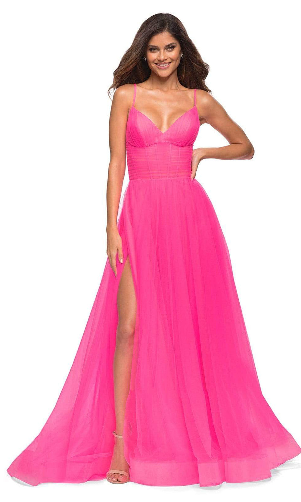 Fall in love with the sheer elegance of this ethereal La Femme 30472. This tulle-made A-line gown has high waist corseted bodice and a V neckline with spaghetti straps. It gives a flowy skirt and then it cuts in mid back while closes with a back zipper closure. Get the party started in this spectacular evening dress from La Femme.