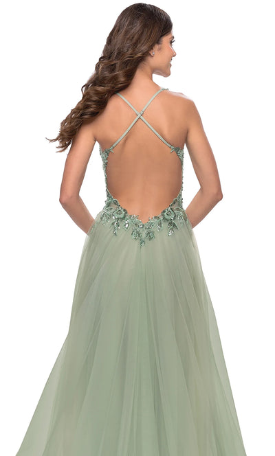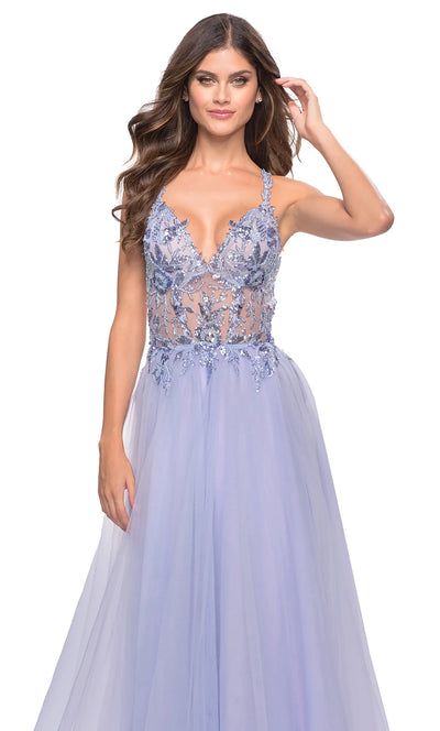 Details: Sleeveless, Sheer Bodice, Lace Applique, Open Back, Crisscross Straps, Back Zipper Closure, Train, Slit