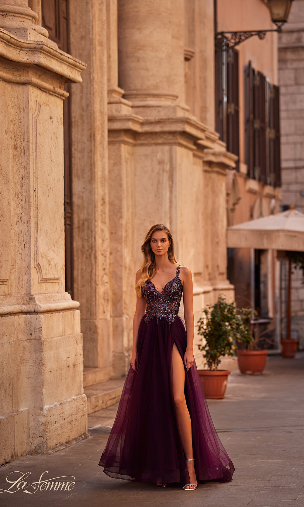Embrace the spotlight in the La Femme 31471 gown. Crafted from luxurious Beaded and Tulle fabric, this dress features delicate spaghetti straps and a flattering V-neckline. The sheer corset bodice adds an element of allure, while the A-line silhouette and high slit provide a touch of drama. The open sexy back and sweep train complete this elegant look. Whether you're attending a gala, prom, or a formal event, this gown promises to make you the center of attention, radiating confidence and style.