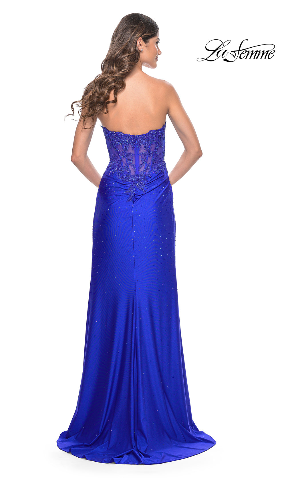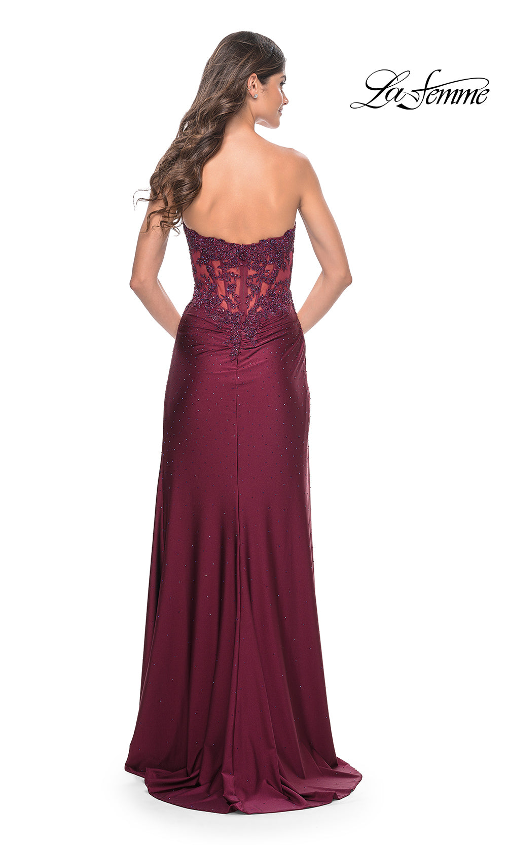 La Femme 332011 is the epitome of glamour and sophistication. This exquisite gown is crafted from Hot Stone/Lace fabric, featuring a timeless Strapless design and a Sweetheart neckline that accentuates your décolletage. The Sheer Corset Bodice is adorned with delicate Beading, adding a touch of sparkle. With a Fitted silhouette and Ruched details, this dress offers a flattering and timeless look. The High Slit and Open Back create a modern twist on classic elegance, making it perfect for a red carpet event, gala, or any formal occasion. The Sweep Train adds a dramatic finish to this stunning gown.