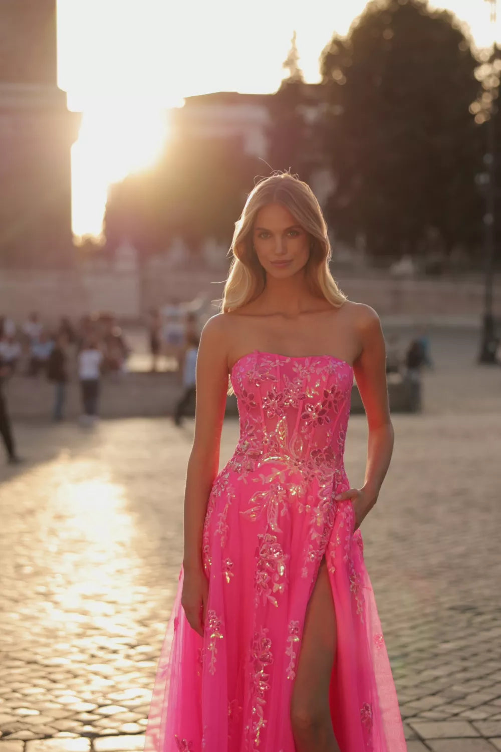 | Details: | Strapless, Sleeveless, Sequin, Corset, High Slit, Horsehair Hem, Open Back, Back Zipper, Sweep Train |