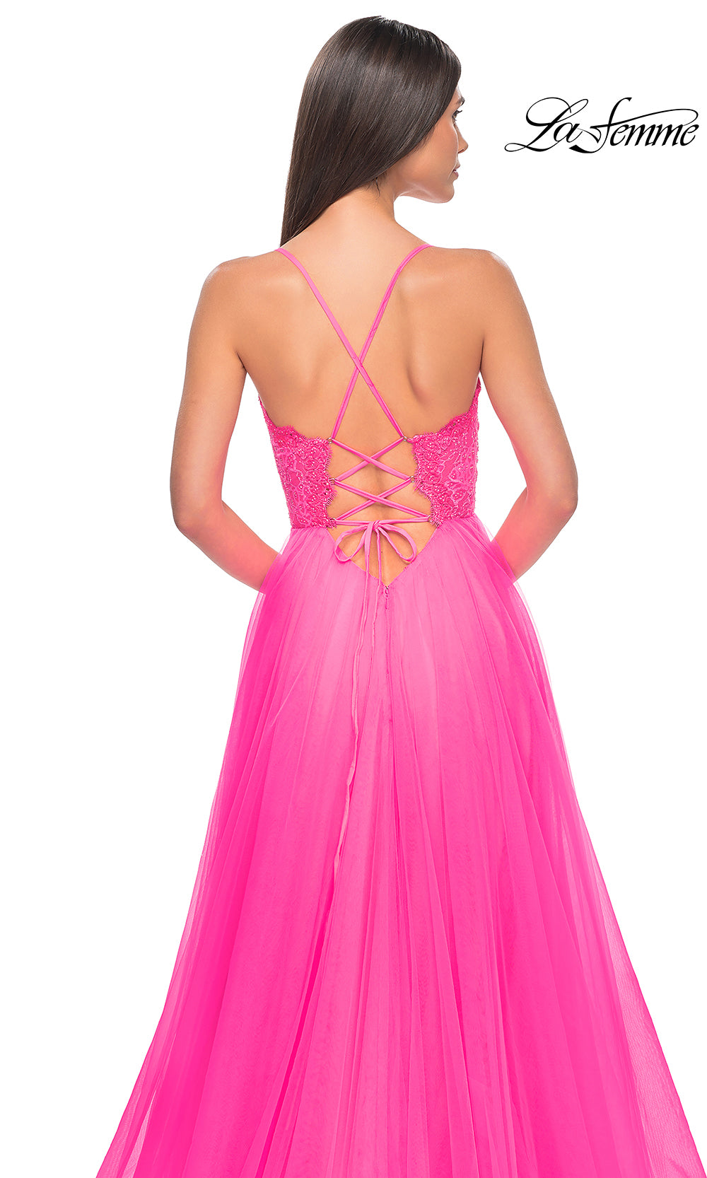 La Femme 32306 is an A-line gown crafted from lace and tulle, designed with a sweetheart neckline and delicate spaghetti straps. The sheer corset bodice features intricate beading, adding a refined touch to the silhouette. The flowing design creates an elegant movement, while a crisscross detail enhances the back. A sweeping train completes the look, making this gown a sophisticated choice for formal events and special occasions.