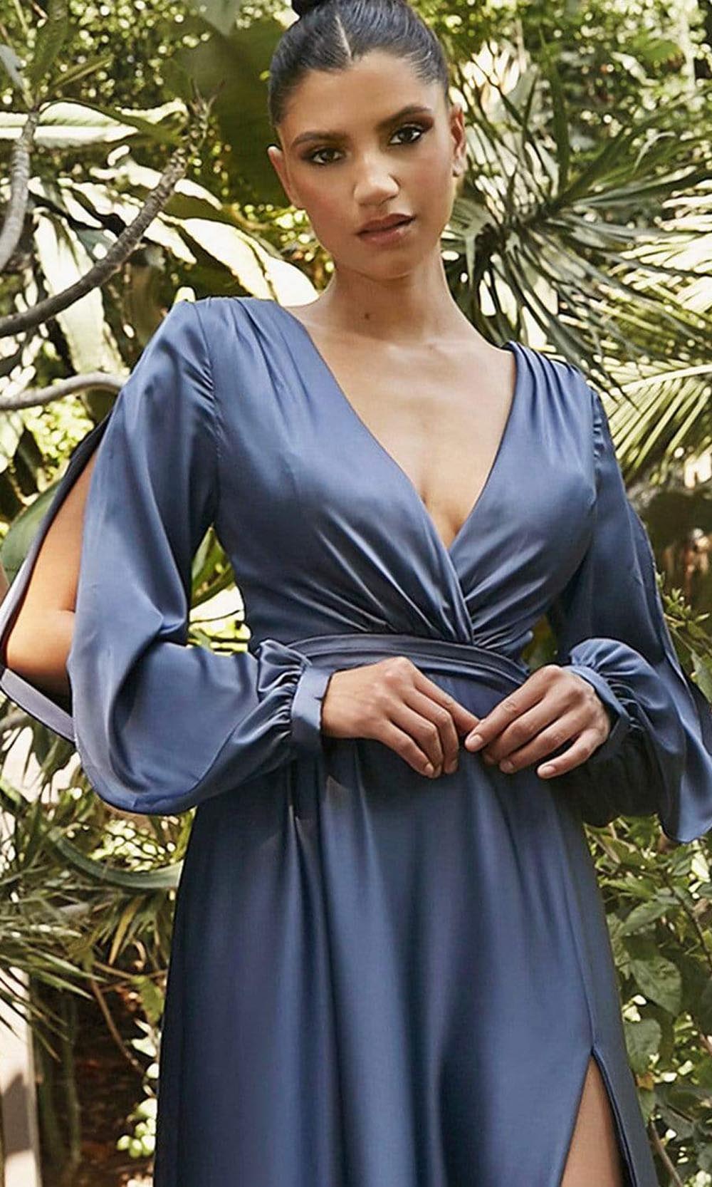 Burgundy Ladivine - 7475 V Neck Long Sleeve High Slit A-Line Gown | Long A-Line Dress Skip to content
