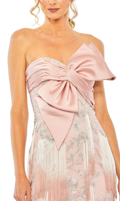 Be the center of attention in Mac Duggal 20593! This stunning strapless dress features intricate embroidery that adds a touch of elegance and sophistication to the overall design. The satin bow at the waist adds a charming and feminine detail. The ombre fringed skirt creates a captivating and unique look, ensuring you stand out from the crowd. The midrise back and zipper closure ensure a comfortable and secure fit. The below the knee hemline adds a touch of refinement and class to the dress, making it suitable for various occasions. With its sweetheart neckline, this dress exudes romance and allure, making it a perfect choice for any special event.