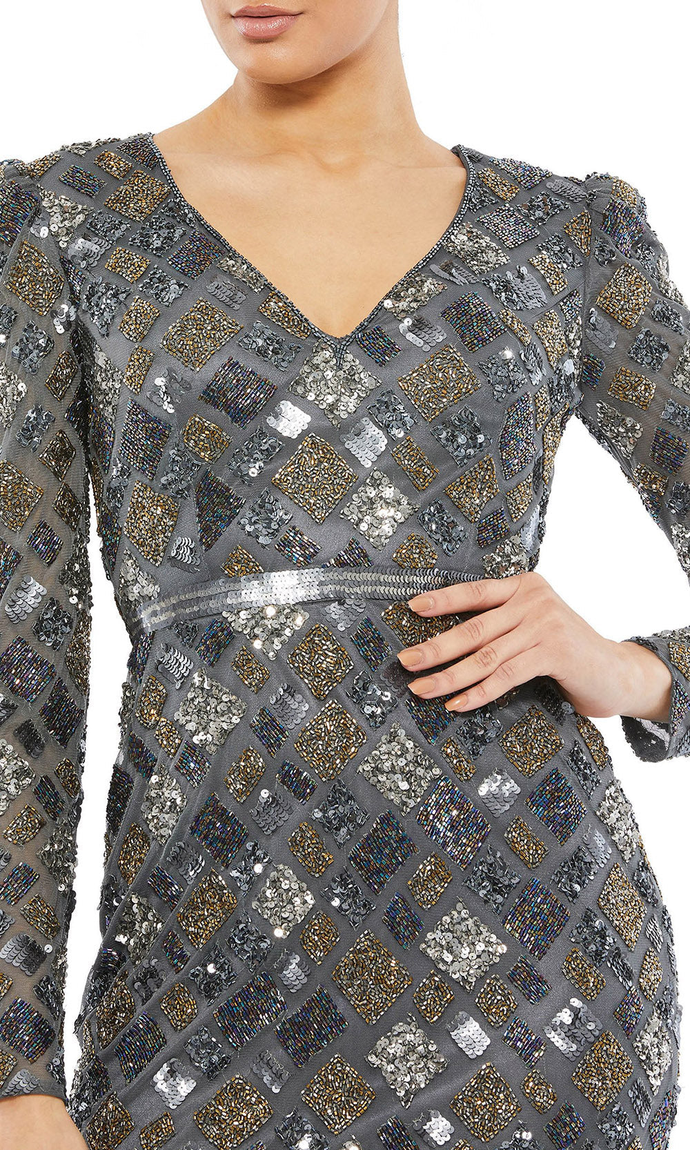Charcoal Mac Duggal Cocktail - 5472D Lattice Beaded V-Neck Dress | Tea Length Sheath Dress Skip to content