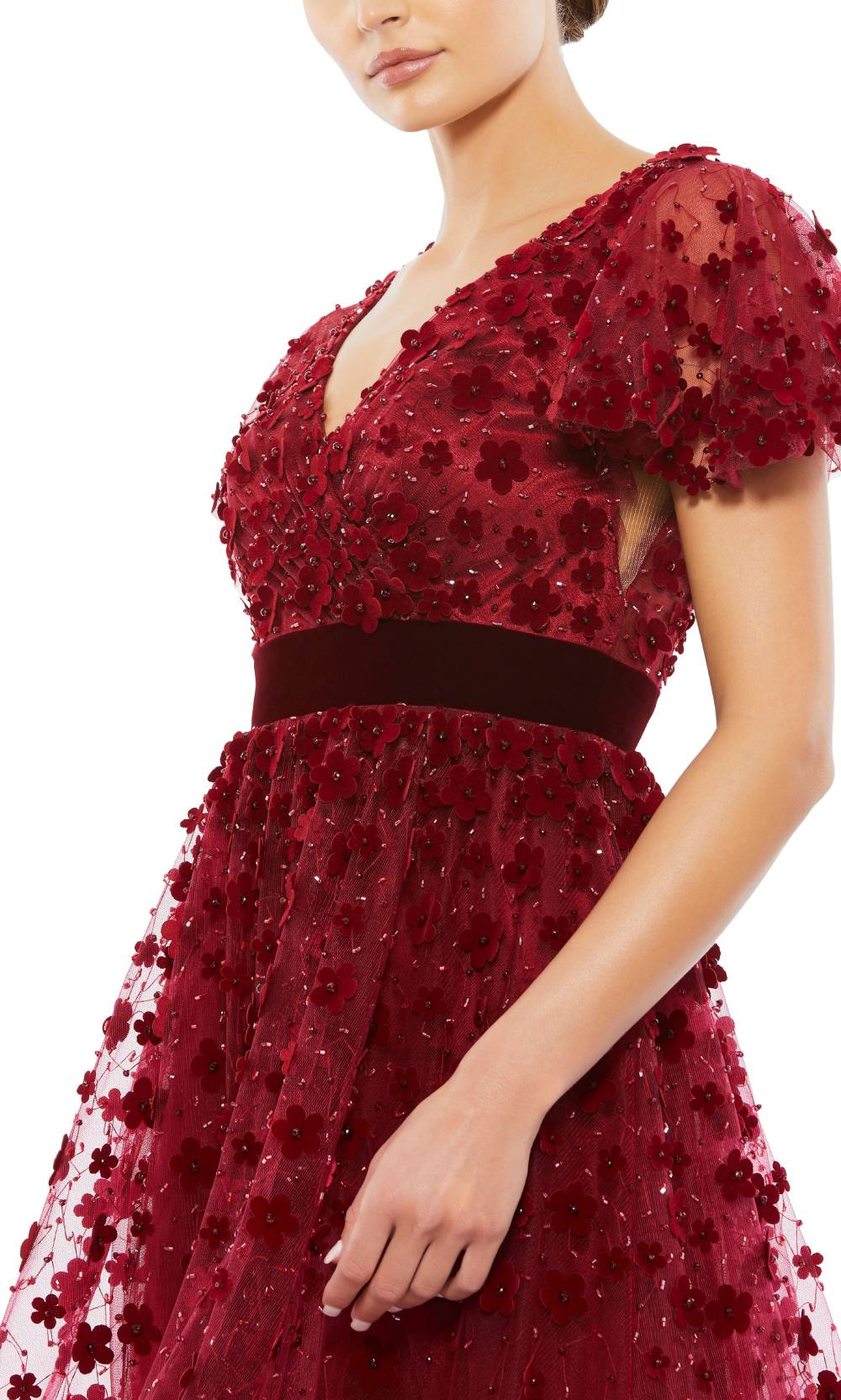 Go beyond beauty in a galactic creation from Mac Duggal Cocktail 67854. This dress graces in V neckline, short sleeves and the full back is enclosed with zipper closure. Beads and 3D floral appliqued create a dimensional accent on the dress. A waistband accents the natural waist, the knee length A-line skirt is designed with a horsehair hemline. This Mac Duggal design is a classic look that works for many special occasions.