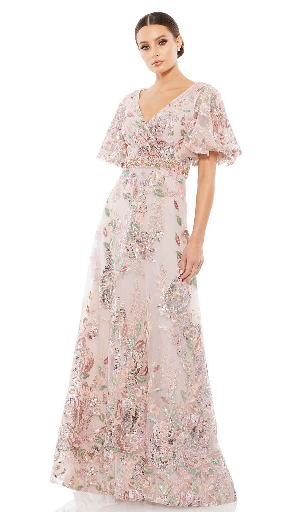 Flatter those alluring assets in this Mac Duggal 67880 creation. Adorned with sequins in flourishing blossoms, this stunner flaunts a v-neckline with short butterfly sleeves. Crowned with multi-colored jewels along the waist, the skirt cascades into a subtle sweeping design. Craft a style that astound in this Mac Duggal masterpiece.