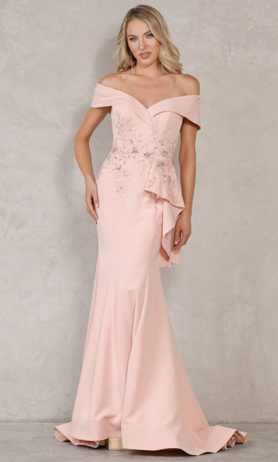 Achieve new heights of fashion in this exquisite long gown by Terani Couture 1911M9339. This masterpiece is divinely fashioned in an excellent fit and flare silhouette, with a folded off-the-shoulder neckline that overlaps over the middle of the fitted bodice. For an extra eye-catching accent, the dress is adorned with beaded embroidered applique. The mermaid skirt reveals a side-draped peplum on the hip and falls flawlessly to a magnificent sweep train. Flatter your shape with a sculpted gown from Terani Couture. The dress images are only available in Blush, Emerald, Navy, Royal, and Wine colors.